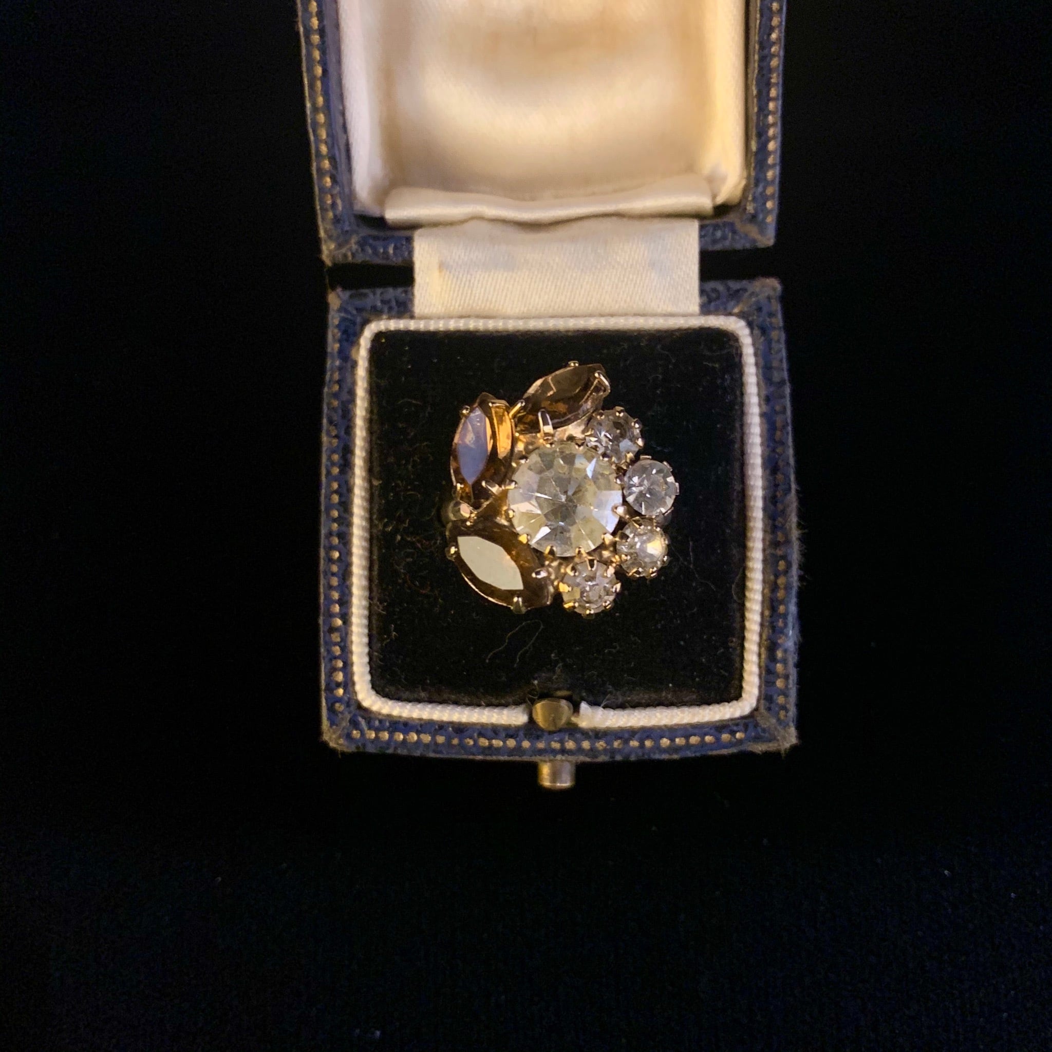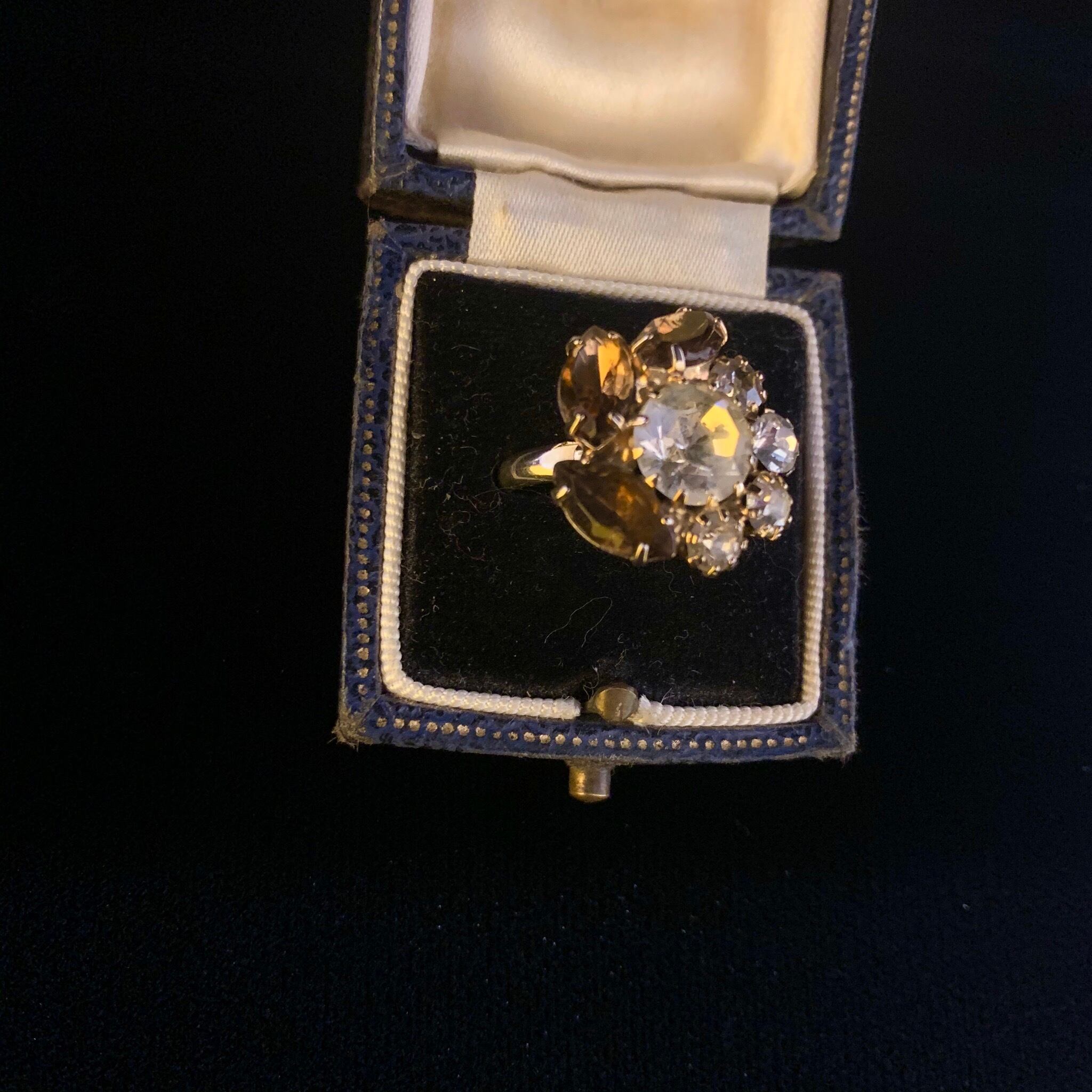 シックなブラウンとクリアなラインストーンを組み合わせたデザインリング。