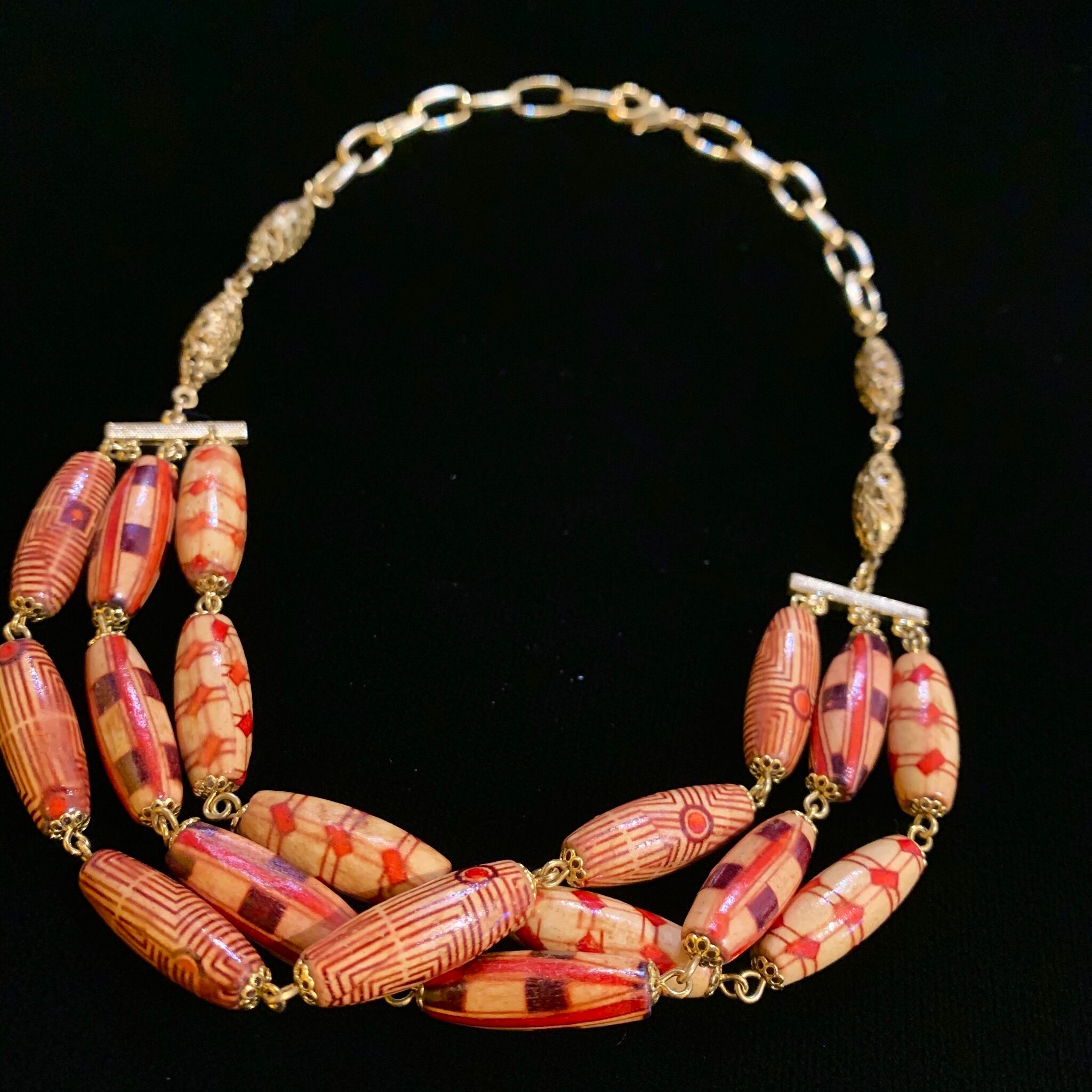 柄の違うウッドビーズが織りなす、レトロな魅力。