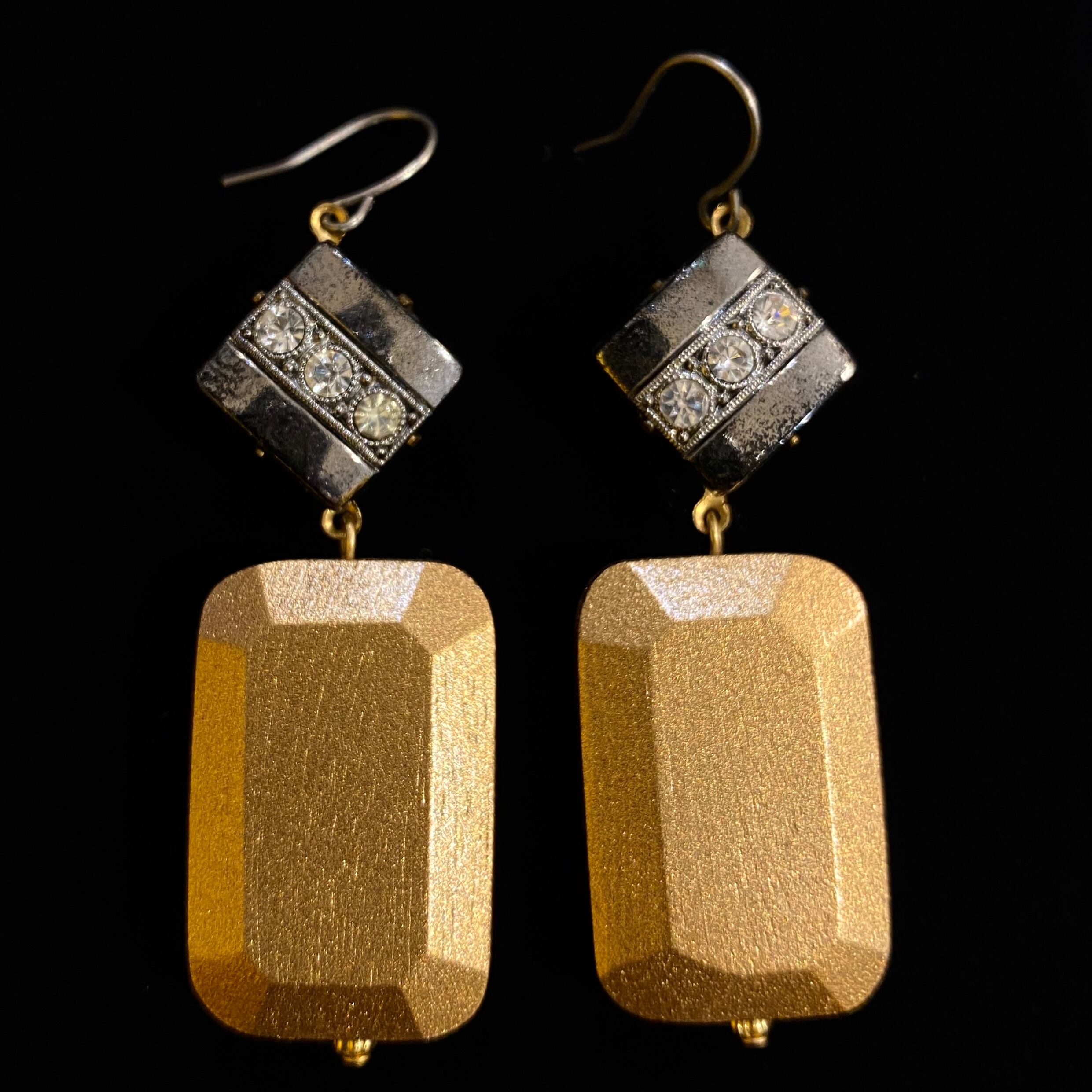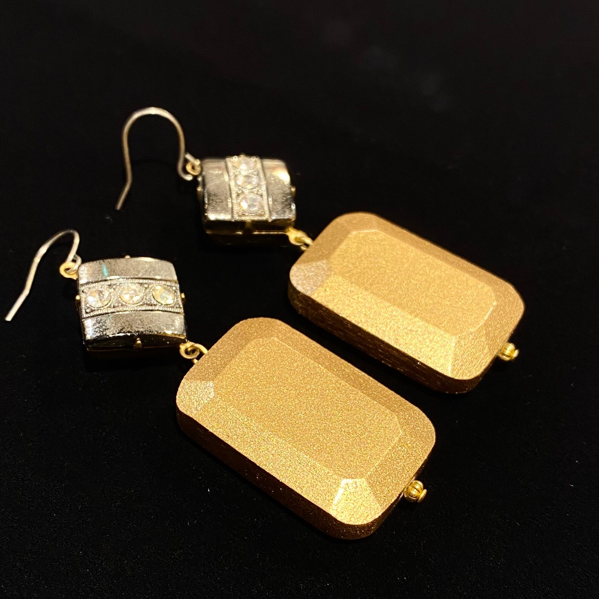 銀灰色のスクエアガラスとゴールドのウッドビーズ。