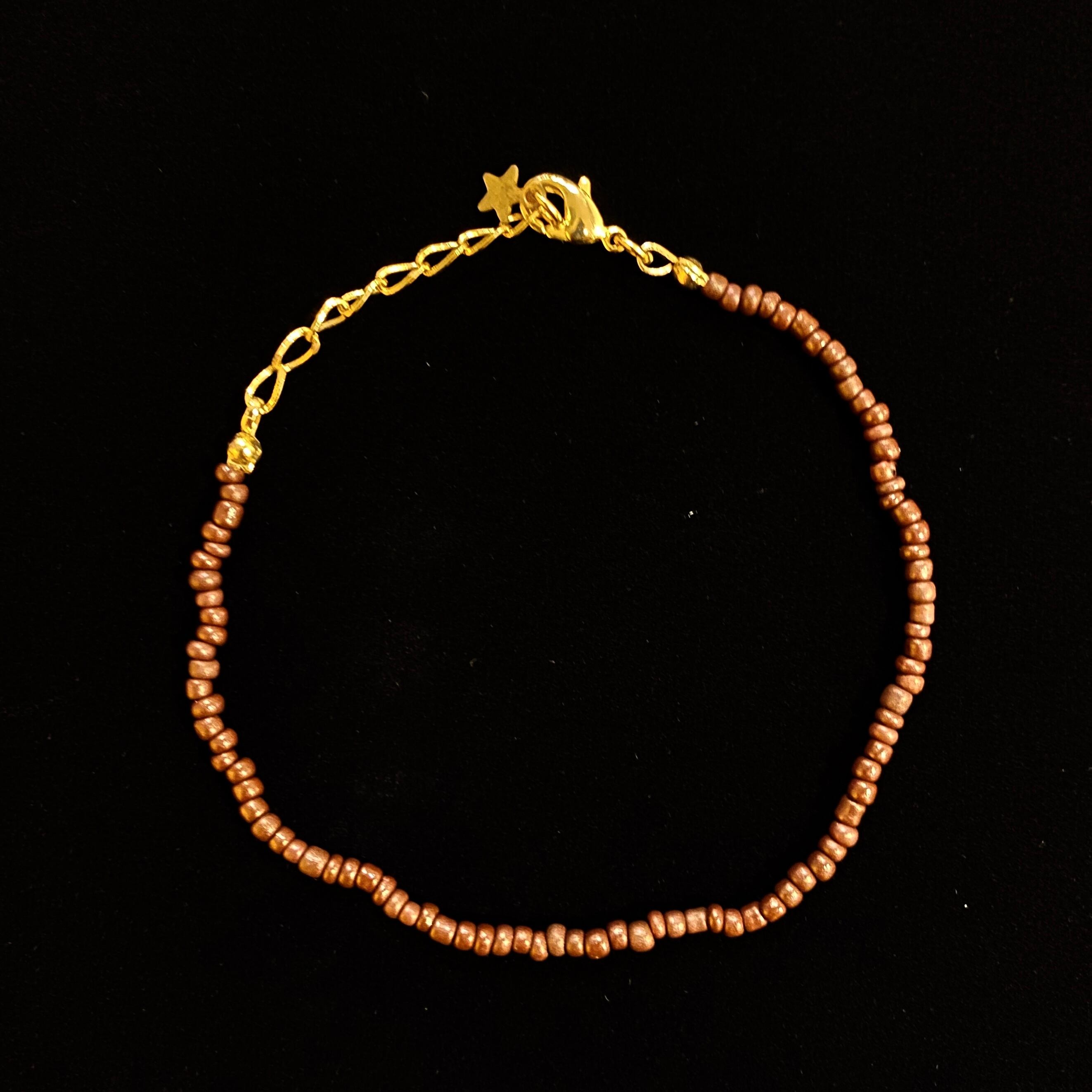 黄色いビーズは半透明、焦げ茶色のビーズは不透明のソリッドカラー。