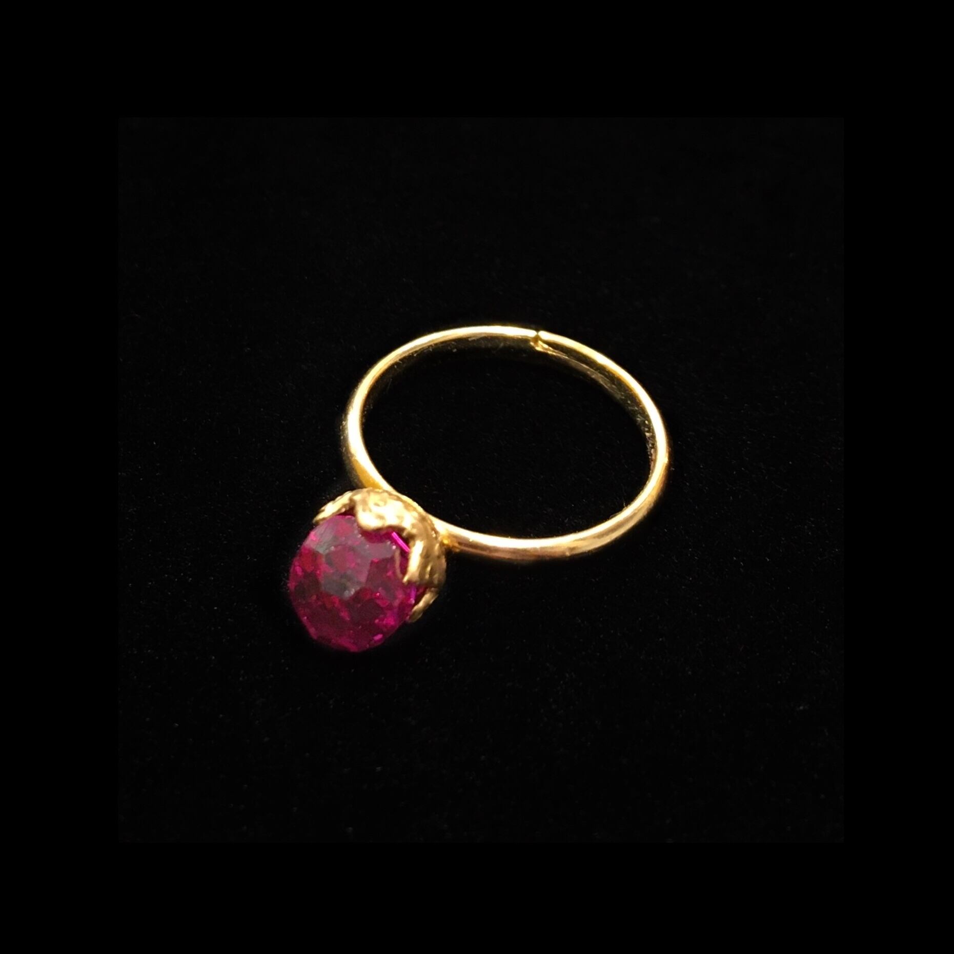 多面的に入ったカットがミラーボールみたいなピンキーリング。