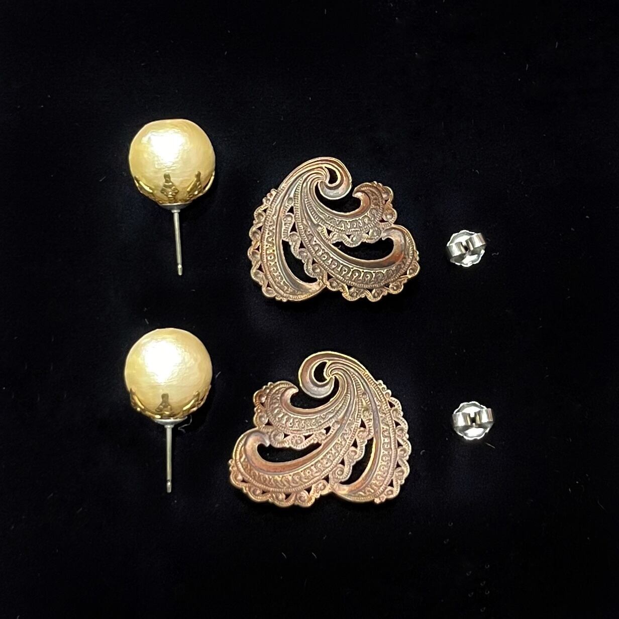 ノーブルなコットンパールは真鍮のキャップで捻りを効かせて。