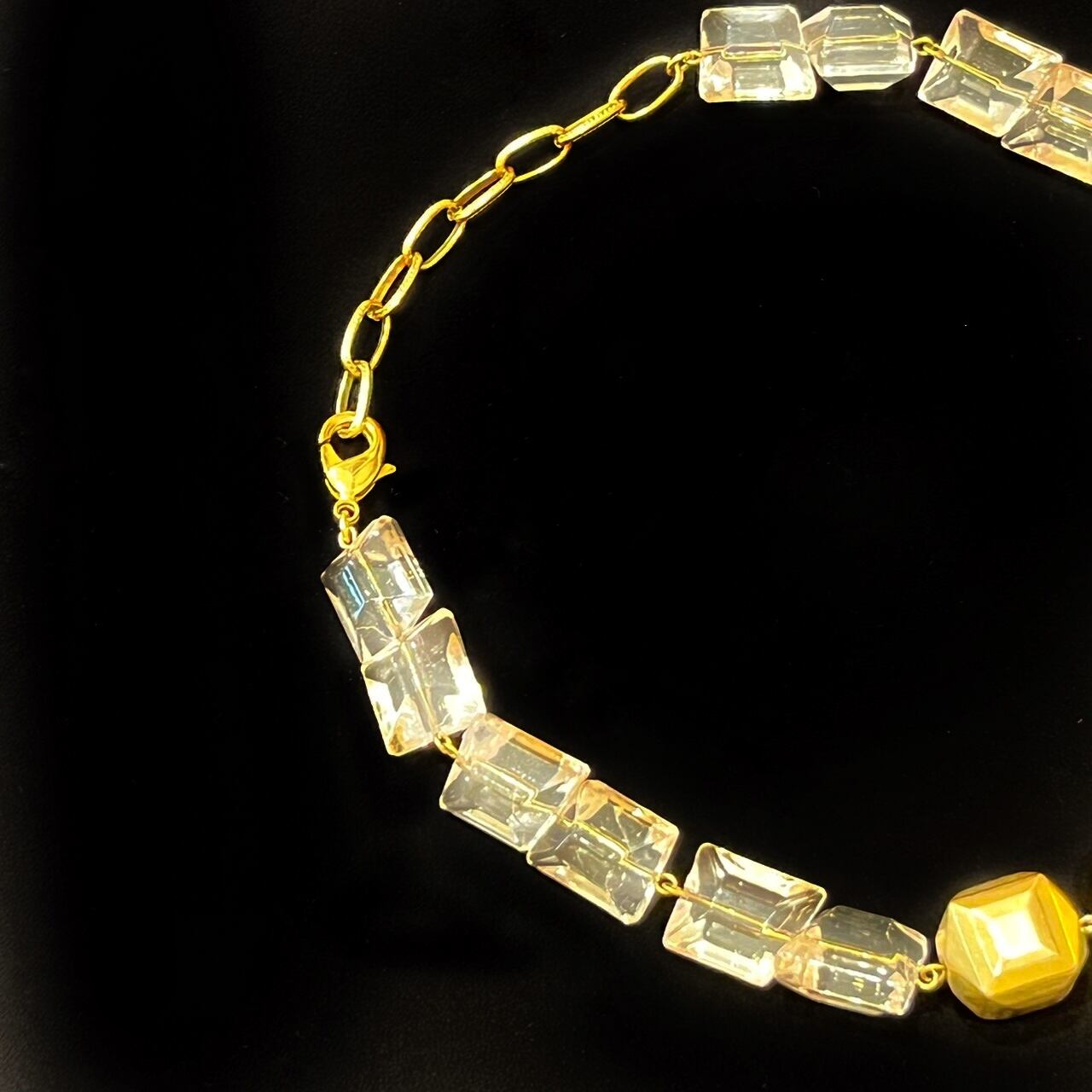 スウィートなクリアピンクとクールなブラスのコントラスト。